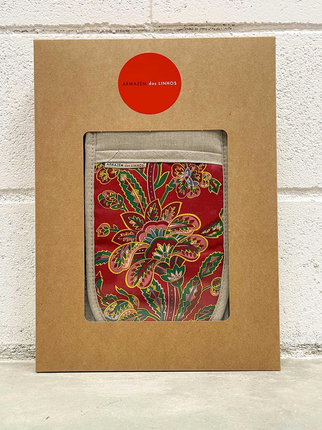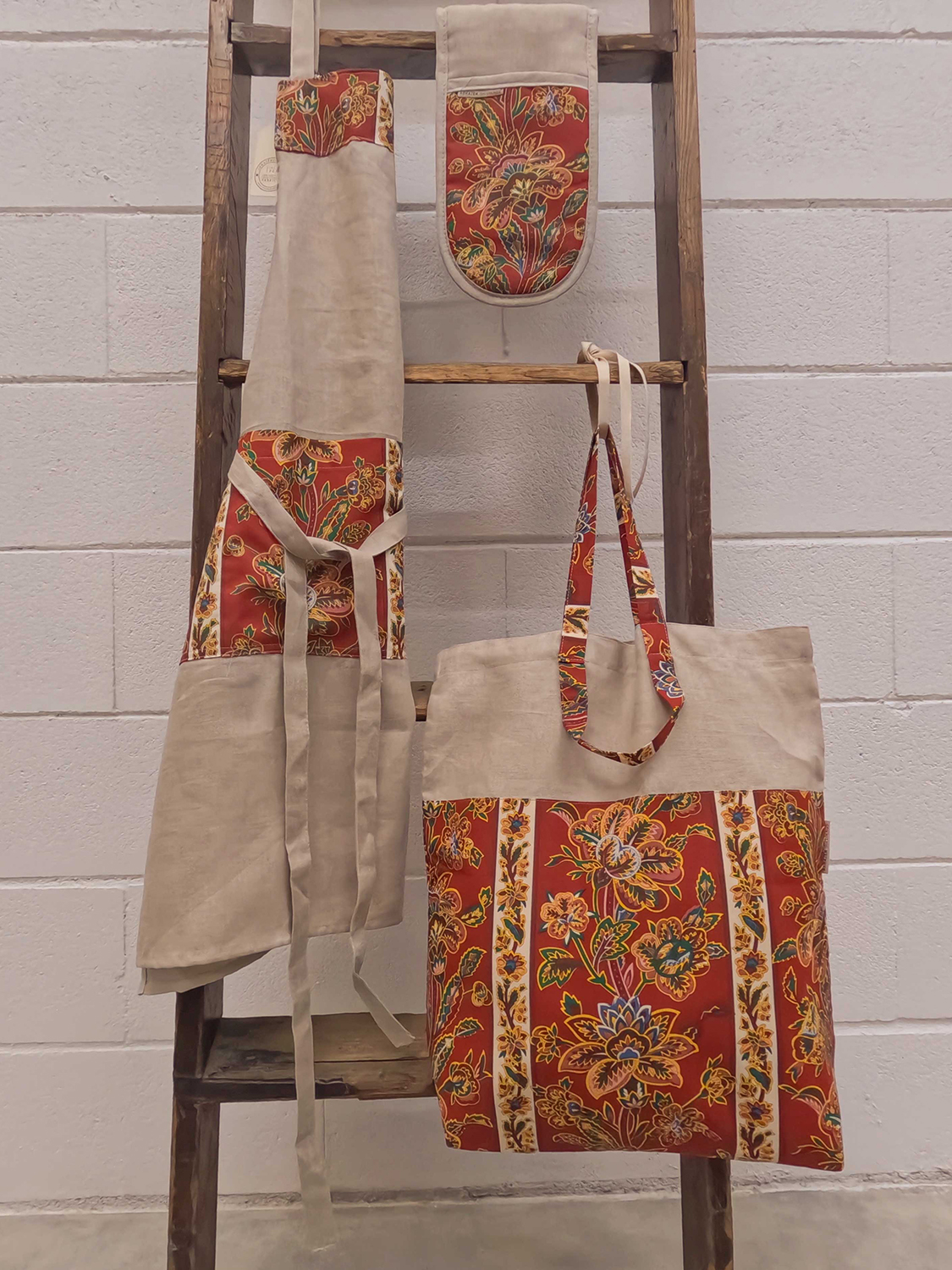 Gift set with an apron, shopping bag and double oven glove in natural linen with printed chintz details. A practical and charming ensemble for everyday kitchen use.