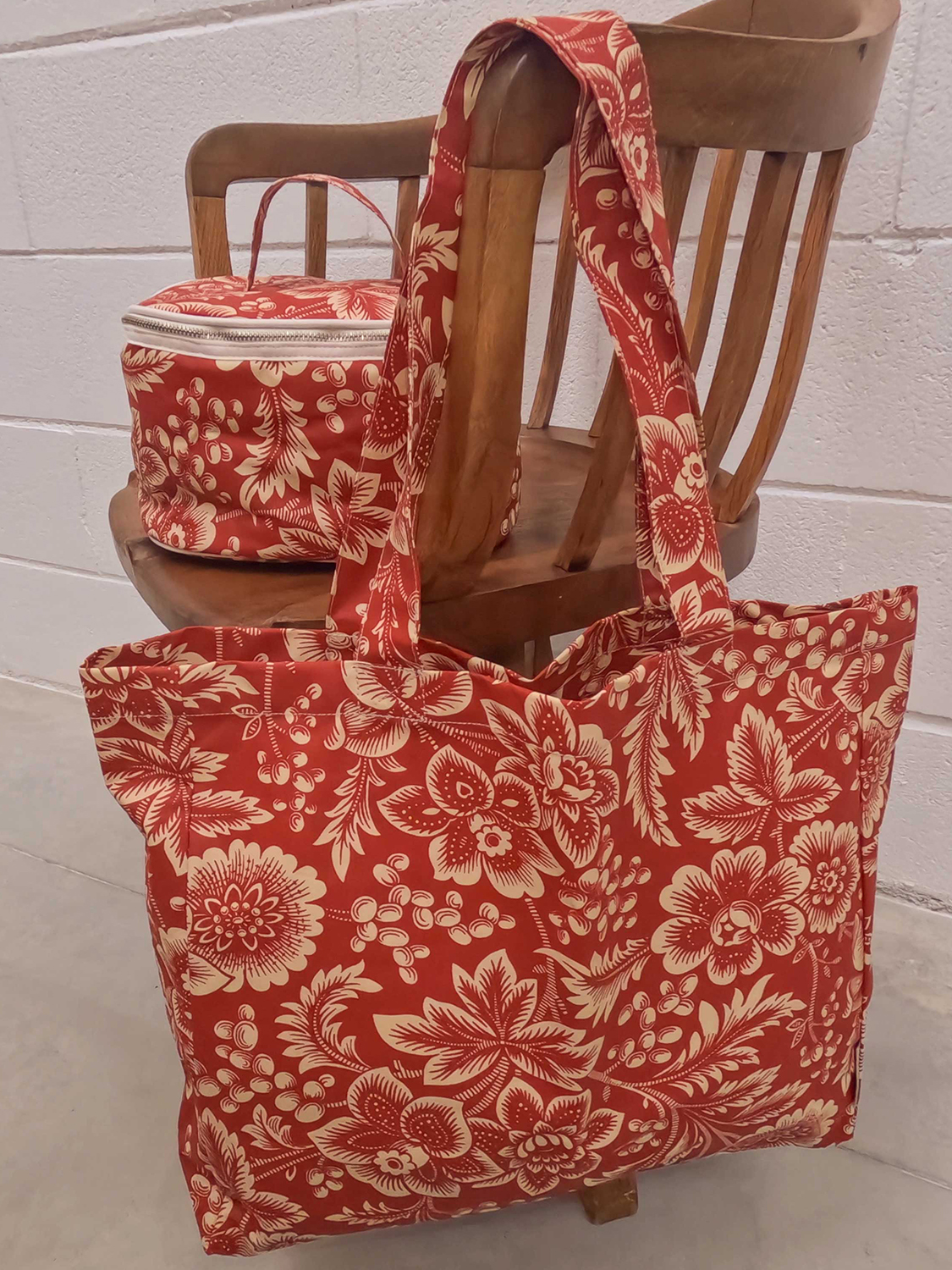 Coffret com necessaire e saco multiusos em chita, ambos com acabamento impermeável e bolso interior. Um conjunto prático e vibrante inspirado nos tons da Índia Vermelha.