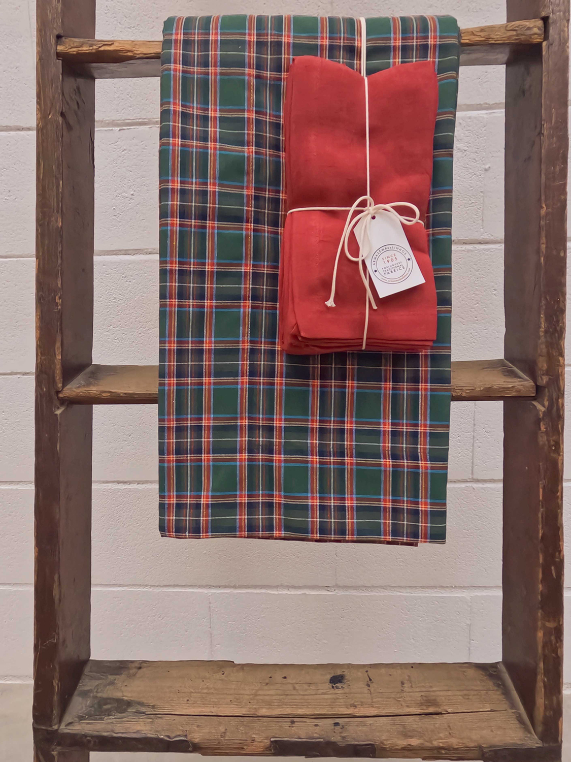 Coffret com seis guardanapos 100% linho em bordeaux e uma toalha aos quadrados 160×250 cm. Um conjunto clássico e acolhedor para criar uma mesa com charme escocês.